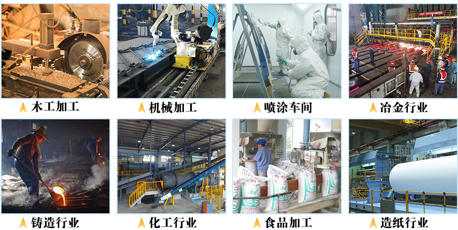 焊接、顏料、塑料、電子、輪胎、鋼板預(yù)處理、粉煤灰、陶瓷、煉化、橡膠、水泥、鈦白粉、倉頂物料等揚(yáng)塵場合。