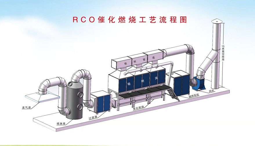 石化行業催化燃燒設備是有活性炭吸附濃縮+催化燃燒(CO)采用活性炭作為吸附劑,結合吸附凈化、脫附再生和催化燃燒原理,將大風量、低濃度的有機廢氣凈化后達標排放的一種高效治理技術。當活性炭吸附飽和后再利用熱風將有機廢氣從活性炭上脫附出來,使得活性炭得到再生;脫附出的有機廢氣被送往催化燃燒室(CO)進行催化氧化,有機物被高溫氧化成為無害的CO2和H2O;。催化燃燒之后的氣體通過換熱器加熱鮮風,熱交換后降溫的氣體部分通過煙囪排放,另一部分用于活性炭的脫附再生;從而達到余熱利用和節能的目的。整套裝置由干式過濾器、活性炭吸附/脫附塔、催化燃燒室、阻燃器、相關風機、閥門、電控系統等部分組成。