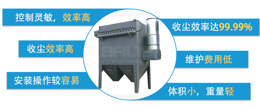 1、采用直角式脈沖閥單排噴吹清灰,清灰能力強,適合各種獨立的產塵點,靈活方便,就地集塵,就地處理,能有效地保證空氣的潔凈度;
