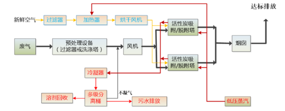 吸附過程:廢氣經空氣過濾器除去微小懸浮顆粒后進入罐內,通過填裝在罐內的顆粒狀活性炭(或活性炭纖維)吸附過濾后再由后置風機排空(如氣體的濃度較高時可采用多節吸附裝置,保證氣體達標排放)。
